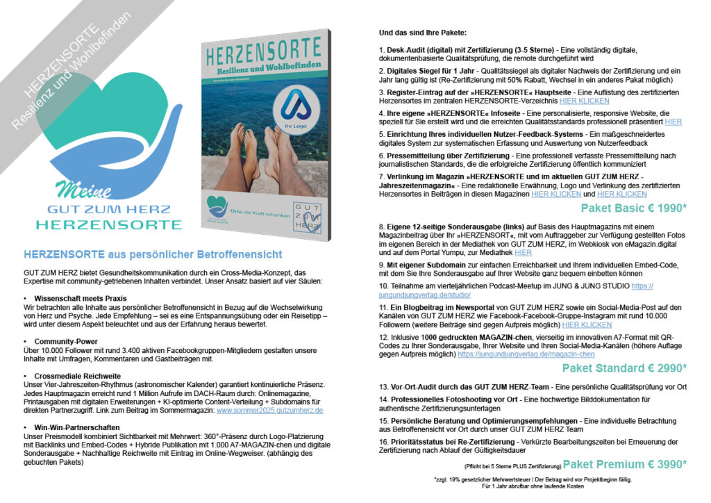 Das Folge-Audit nach 12 Monaten kombiniert die bewährten objektiven Kriterien mit den gesammelten Erfahrungen aus dem realen Umgang mit dem Ort. Die Ergebnisse des kontinuierlichen Nutzer-Feedbacks fließen als verbindliches Kriterium in die erneute Qualitätsprüfung und Re-Zertifizierung ein. Auch bei der Re-Zertifizierung erfolgt eine fachliche Plausibilitätsprüfung durch Expert:innen; keine Therapie-/Heilversprechen. Diese datengestützte Herangehensweise gewährleistet, dass sich die HERZENSORTE nicht nur theoretisch, sondern auch in der gelebten Praxis bewährt haben und kontinuierlich weiterentwickeln. Alle Partner, die nach 12 Monaten verlängern, erhalten 50 % Rabatt auf den aktuellen Paketpreis. Ein Wechsel in andere Pakete ist jederzeit möglich – auf Wunsch auch mit Upgrade auf die Pakete Standard oder Premium.